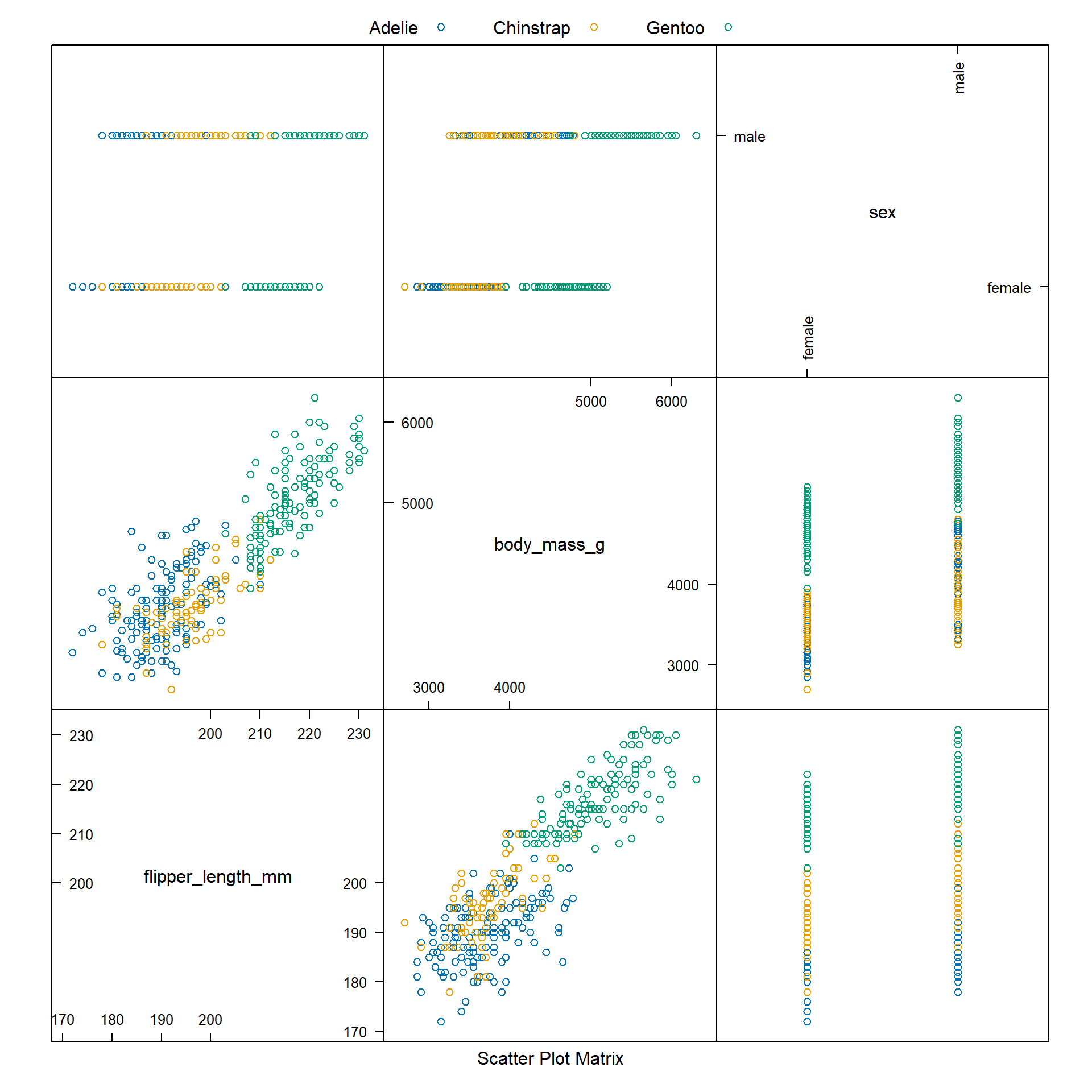 However, it is worthwhile to note that the caret package offers several options for visualising data, via the featurePlot function. We can use this function (with the argument plot = "pairs") to produce a scatter plot matrix of the different feature variables we are using, coloured by penguin species (as shown below).